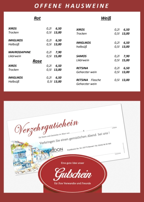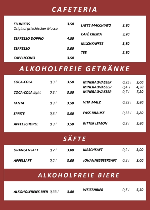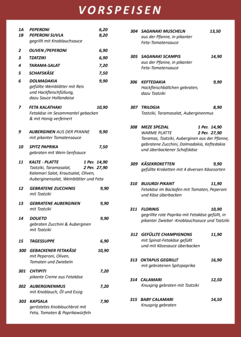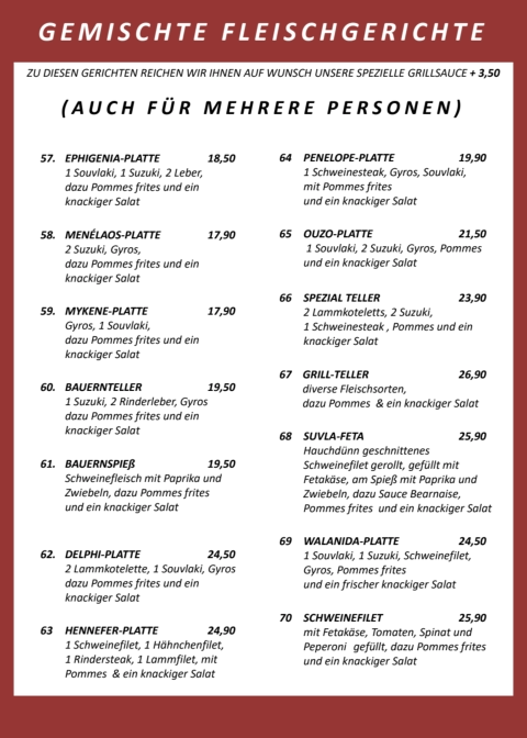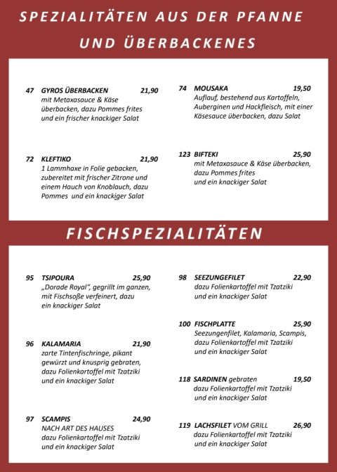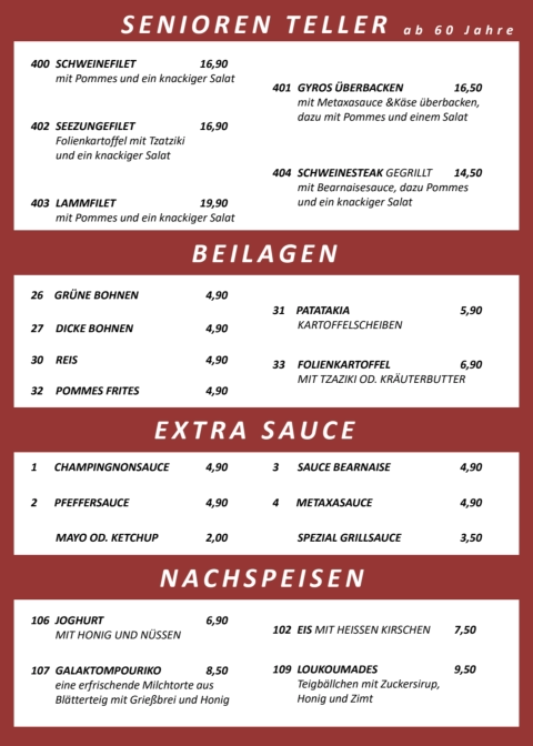 Griechische Spezialitäten in großzügigen Portionen in einem klassischen Restaurant, im Sommer mit Biergarten und überdachter Aussenterrasse.